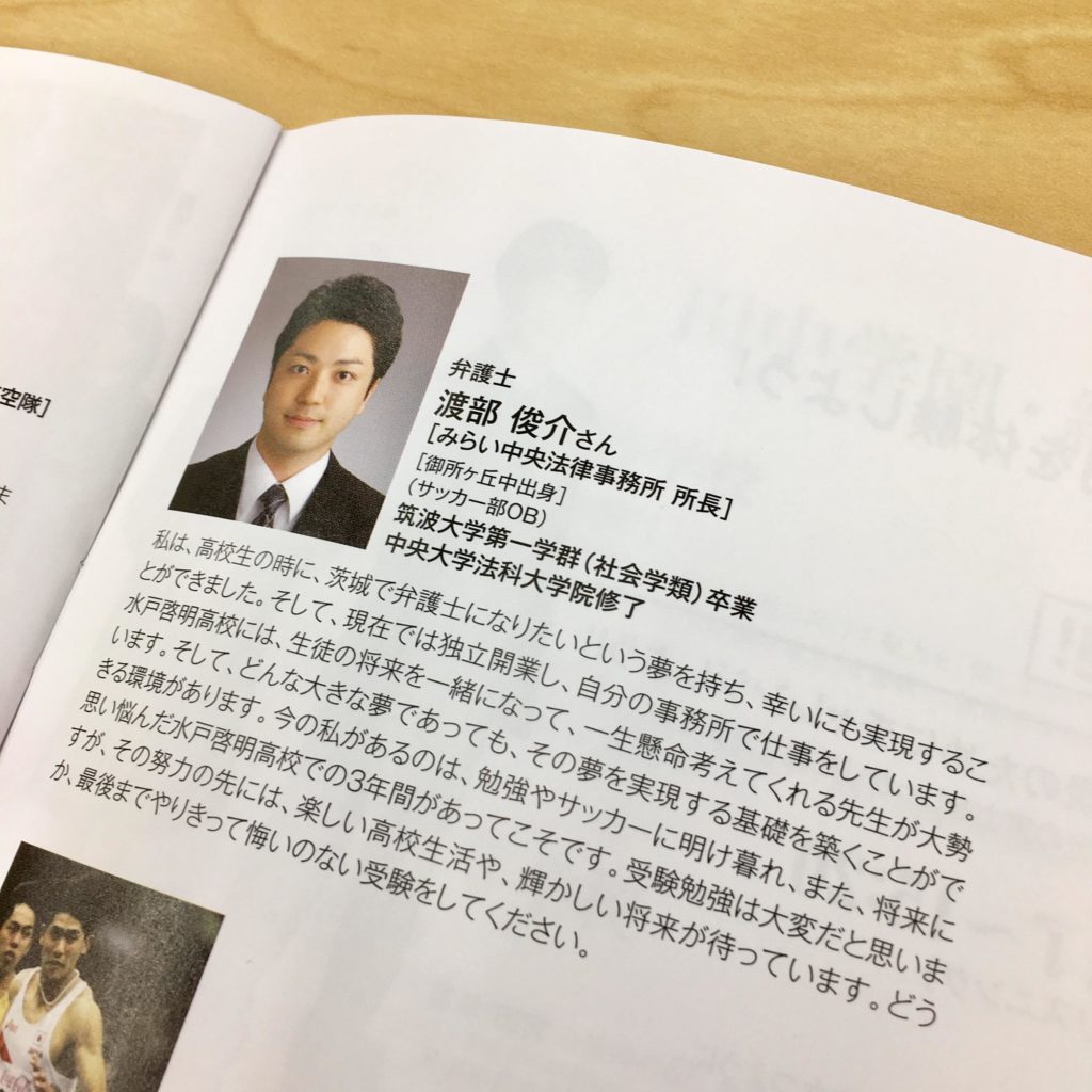 当事務所の弁護士・渡部俊介が、出身校である水戸啓明高等学校(旧水戸短期大学附属高等学校)のパンフレットにおきまして、「はばたく卒業生」として紹介いただきました。